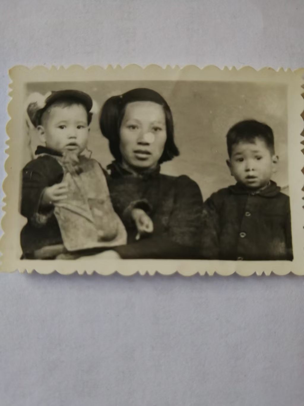 2、母亲和我及大弟的合影。大胆推测,此照片是1965年3月8日弟弟2岁生日时母亲带我们兄弟俩去百顺街照相馆拍摄。时年母亲27岁,我4岁,大弟2岁。是我们兄弟俩唯一与母亲的合影,也是我和大弟最早的照片,至今已60年。