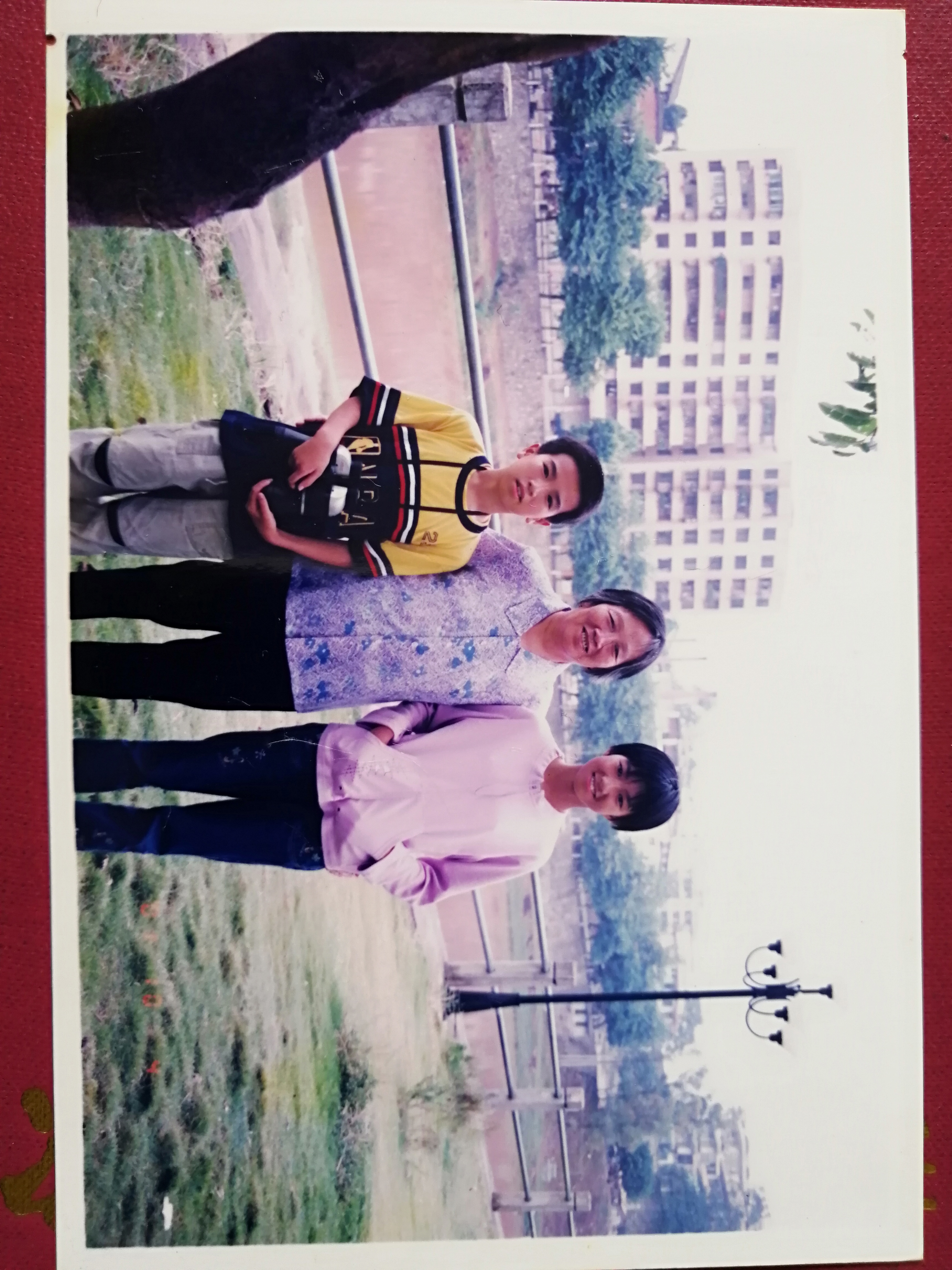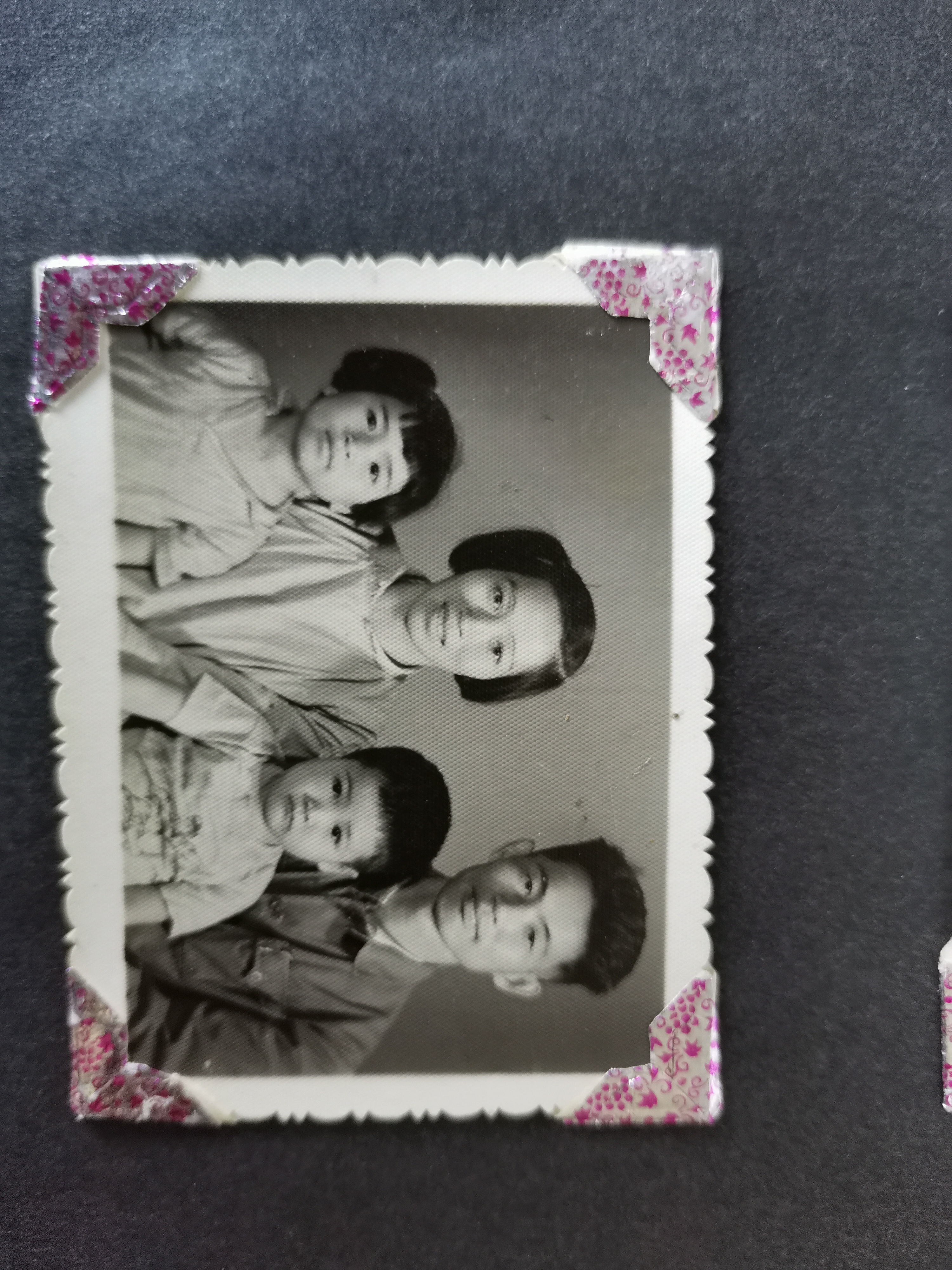 3、父母亲与妹妹弟弟的合影。在模糊的记忆里,此照片是父亲在主田公社工作期间所照。如此推测拍摄时间为1970年夏天,母亲带弟妹去主田探亲期间,在公社的照相馆拍摄。时年父亲36岁,母亲32岁,妹妹5岁,弟弟2岁,这也是妹妹和小弟最早的照片,至今已55年。彼时父母亲都显清瘦,与当时生活清贫、工作劳累相关。