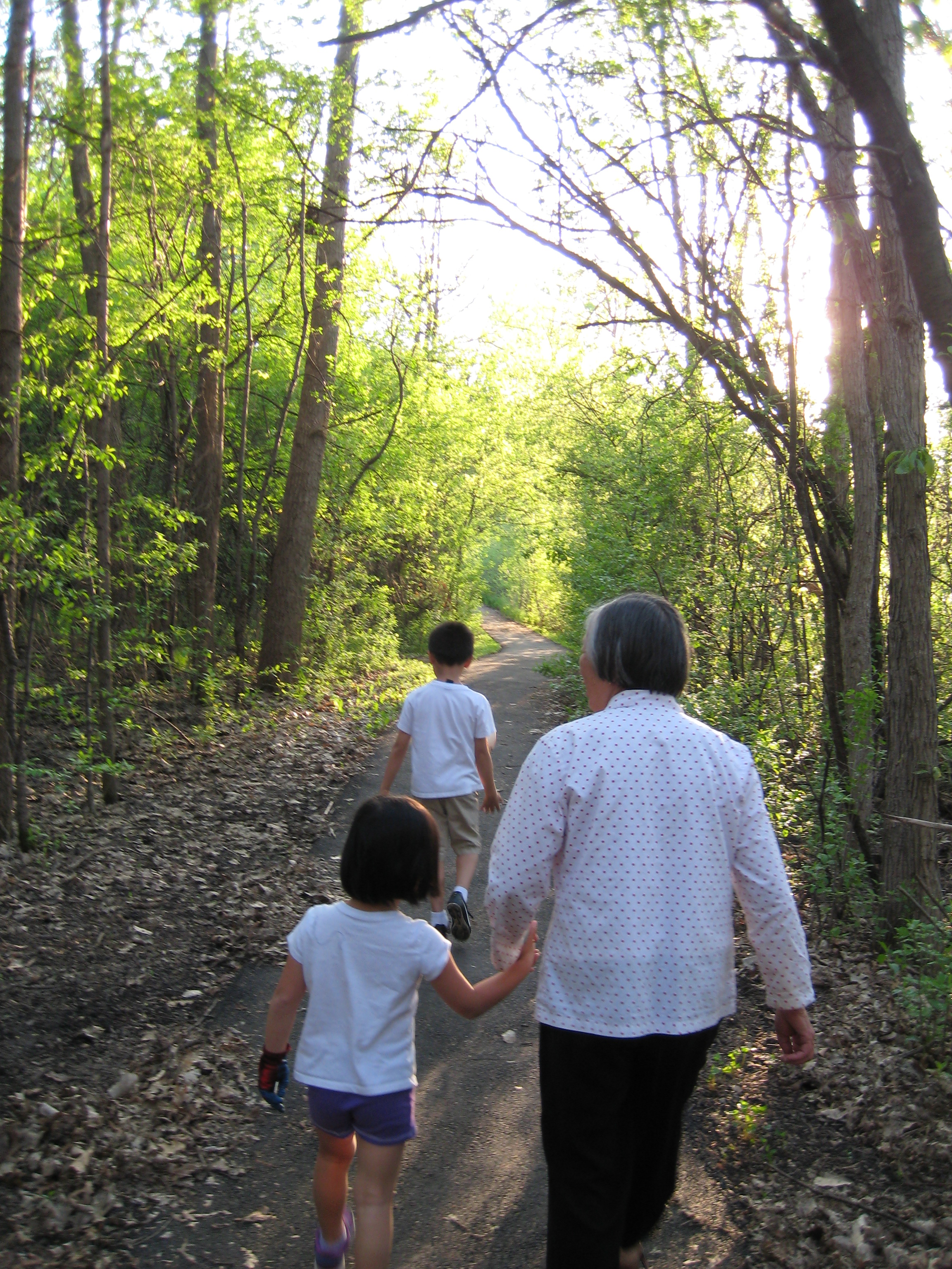 13、母亲与两个孙儿。拍摄时间为2014年5月23日,地点为芝加哥弟弟家中附近的树林里,哥哥在前面带路,妹妹牵着奶奶的手走在后面。时年母亲76岁。